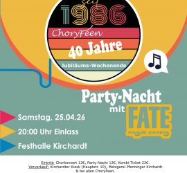 Unser Chorkonzert am Freitagabend ist bereits ausverkauft! Wer mit uns feiern möchte sollte zur PartyNacht mit der Coverband Fate am Samstagabend in die Festhalle Kirchardt kommen, hier sind noch Karten bei den Vorverkaufsstellen und an der Abendkasse erhältlich (12€). Falls es tatsächlich noch jemanden gibt, der Fate nicht kennt – […]