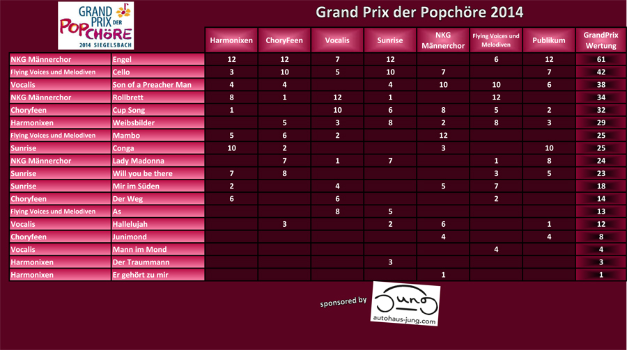 Beim diesjährigen SongContest in Siegelsbach konnten viele Chöre überzeugen – das Teilnehmerfeld lag sehr eng beieinander. Absolut überzeugend und herausragend war die Leistung des NKG-Männerchores aus Mosbach. Für einen Podestplatz hat es in diesem Jahr für uns leider nicht gereicht…