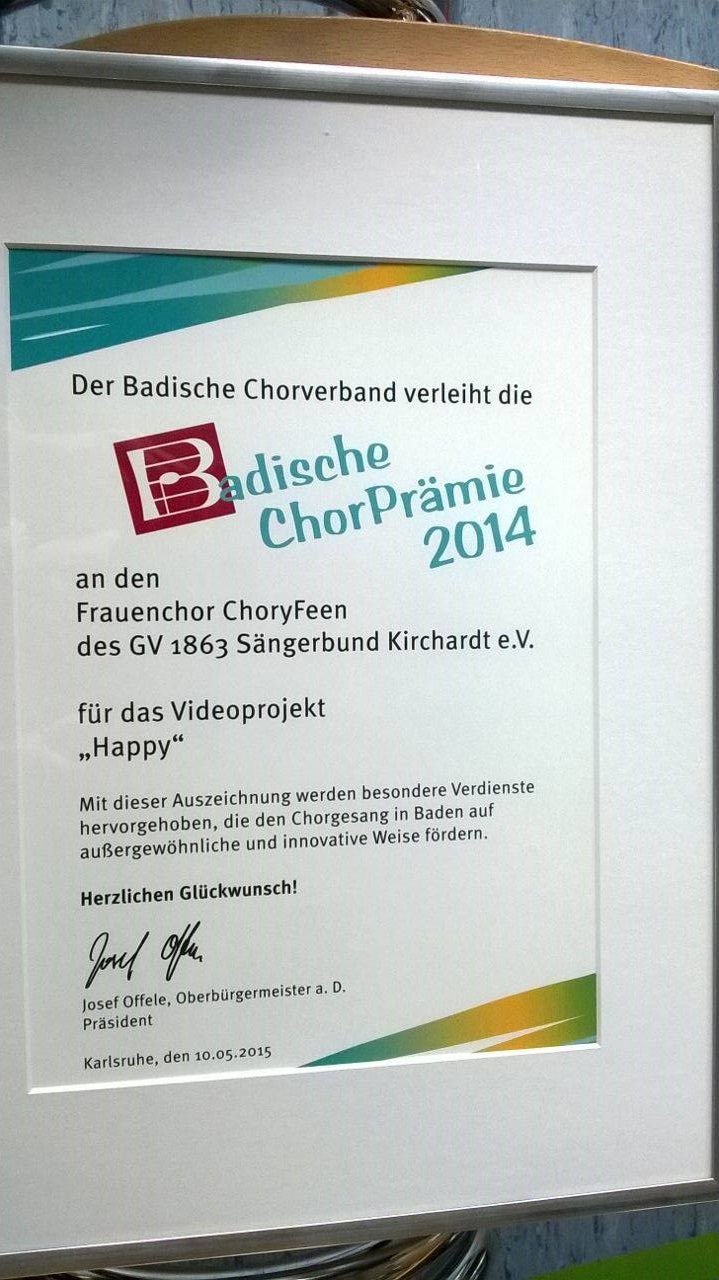 Wir freuen uns, dass wir in diesem Jahr die Jury mit unserem Video-Projekt „Happy“ überzeugen konnten. Beim Chorverbandstag am Sonntag, 10. Mai, konnten wir die Urkunde und den Preis entgegennehmen.