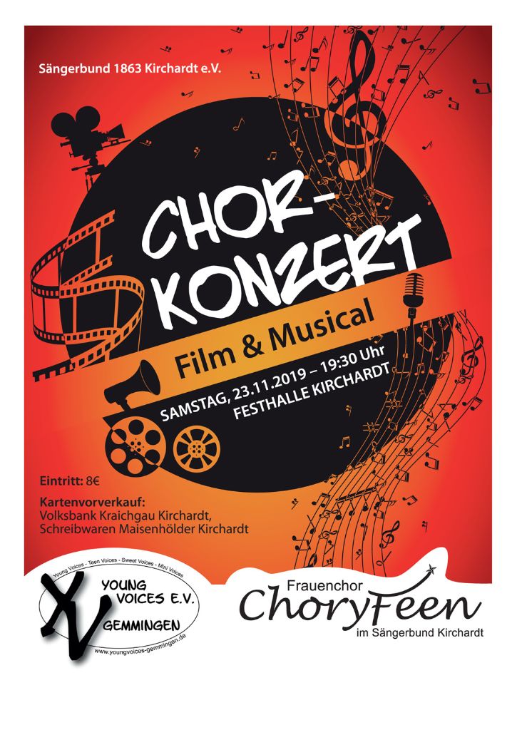 Am 23. November 2019 geben wir in der Festhalle Kirchardt unser nächstes Konzert. An diesem Abend stehen Titel aus Musical & Film auf dem Programm. Bekanntes und weniger Bekanntes, Lustiges und Songs zum zurücklehnen – es wird auch dieses Mal wieder für jeden etwas dabei sein!